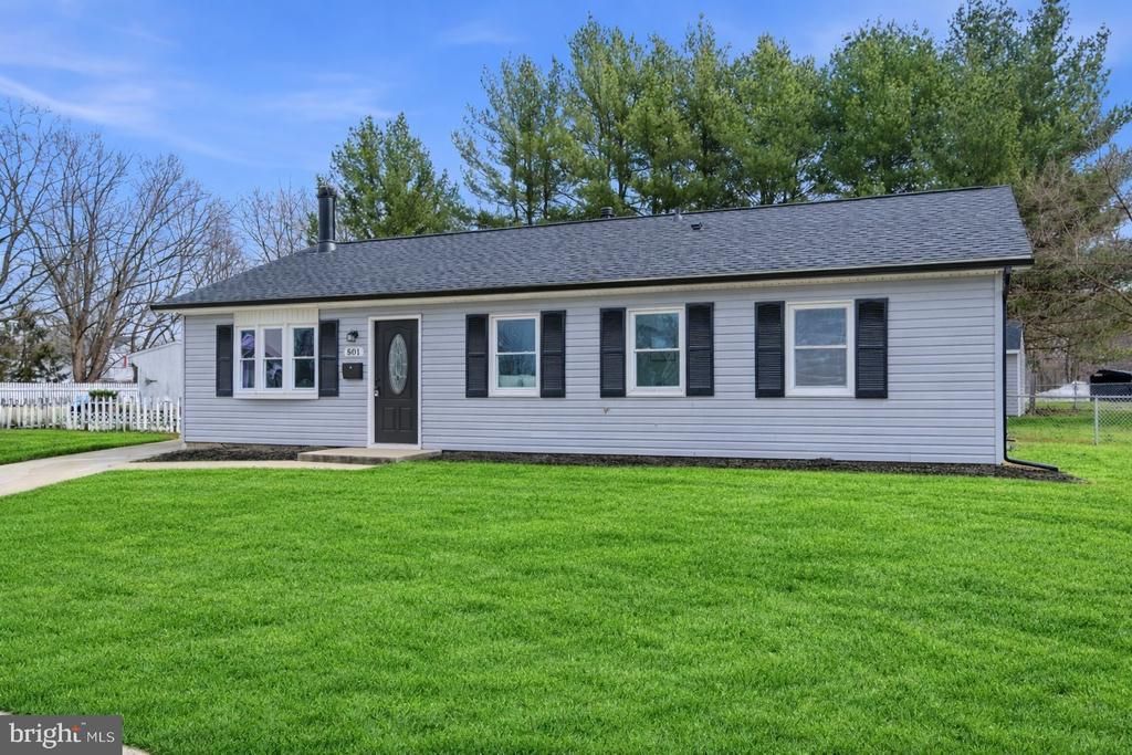 Beautifully renovated rancher in desirable Edgewood Meadows, offering bright, one-level living with an open-concept layout and abundant natural light throughout. The inviting living area features a cozy wood-burning fireplace, creating the perfect space to relax or entertain. The updated kitchen shines with quartz countertops, stainless steel appliances, gas cooking, and a fresh, modern feel. A convenient laundry room is located just off the kitchen for added functionality. This home includes four spacious bedrooms, all outfitted with new plush carpeting and ceiling fans. The primary bedroom features its own private half bath, while the large hall bathroom offers a full tub and plenty of space. Step outside to a fully fenced backyard with a covered patio just off the kitchen — ideal for outdoor dining, entertaining, or simply enjoying your morning coffee. A large driveway provides parking for 3–4 cars. Perfectly situated in a convenient location close to shopping, dining, and major commuter routes, this move-in ready home offers the ideal blend of comfort, style, and accessibility — all in sought-after Edgewood Meadows.